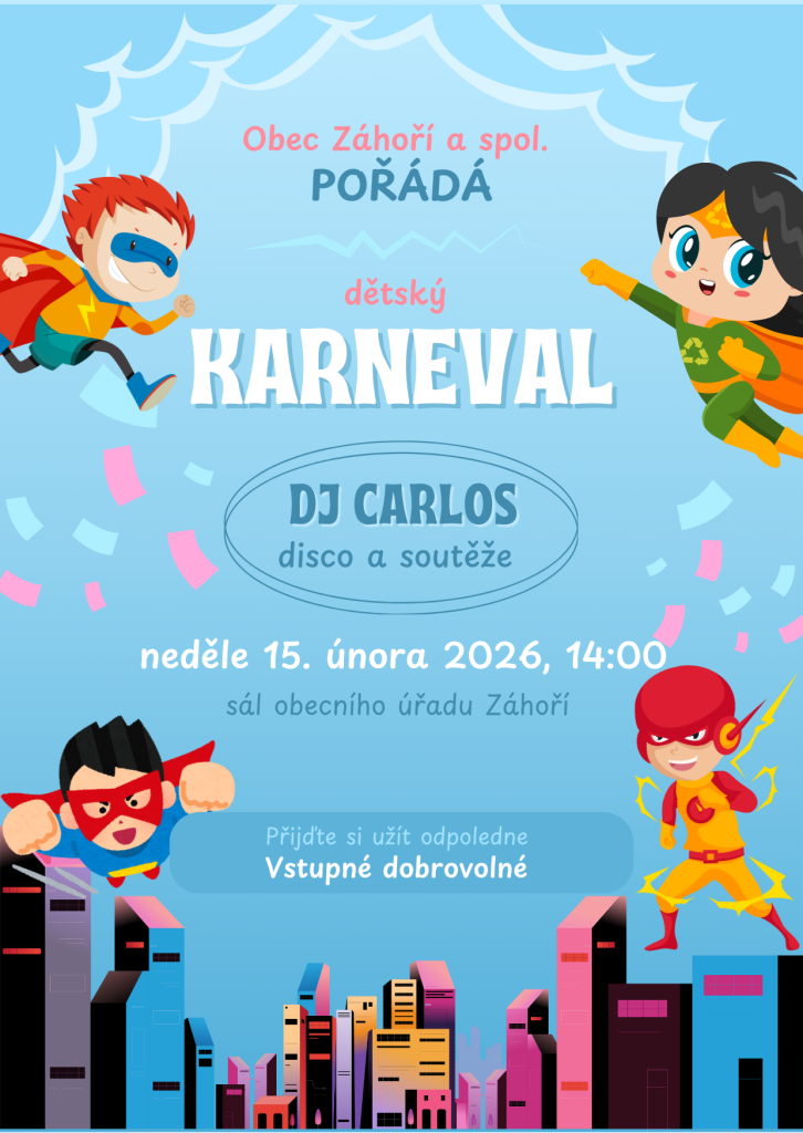 Zveme všechny mladé lidi na dětský karneval, který se uskuteční 15. února 2026 v Záhoří. Přijďte si užít den plný zábavy, her a soutěží. Tato akce je určena pro malé i velké, kteří se chtějí pobavit v kostýmech. Těšíme se na vaši účast a věříme, že společně strávíme krásný den.
