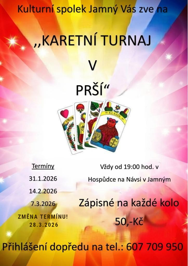 Karetní turnaj se koná vždy od 19:00 hodin v Hospůdce na Návsi. Turnaje probíhají v několika termínech: 31. ledna, 14. února, 7. března a 28. března 2026 (změna z 21.3.)