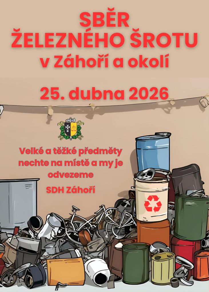 Hasiči Záhoří pořádají sběr železného šrotu v Záhoří a okolí. Akce se uskuteční v dopoledních hodinách 25. dubna 2026. Vyzýváme všechny občany, aby se zapojili a přinesli svůj železný odpad k ekologické recyklaci. Tímto způsobem pomůžeme našemu životnímu prostředí a podpoříme naše hasiče.
