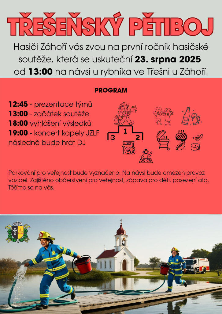 Hasiči Záhoří vás srdečně zvou na první ročník hasičské soutěže Třešeňský pětiboj, která se uskuteční 23. srpna 2025 od 13:00 na návsi u rybníka v Třešni u Záhoří. Program začíná již v 12:45 prezentací týmů, následovat bude soutěž a vyhlášení výsledků v 18:00. Na závěr se můžete těšit na koncert kapely JZLF a následně bude hrát DJ . Pro návštěvníky je zajištěno občerstvení a zábava pro děti, parkování bude vyznačeno a provoz vozidel na návsi omezen. Těšíme se na vaši účast!