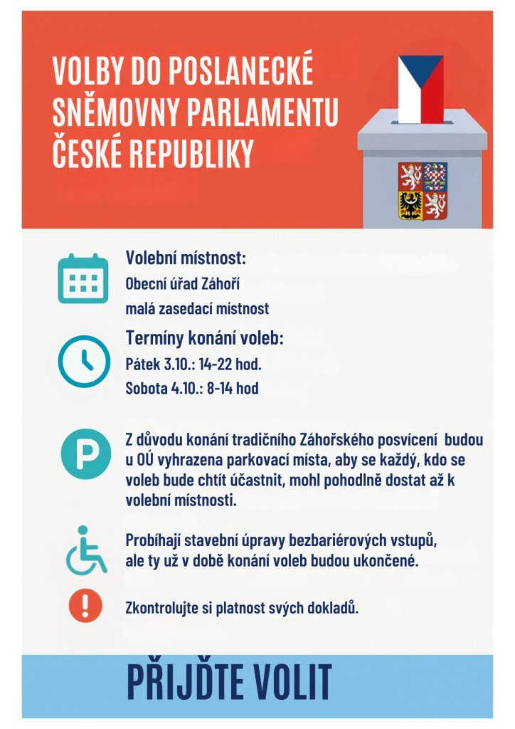 Ve dnech 3. a 4. října 2025 se uskuteční volby do Poslanecké sněmovny Parlamentu ČR. Hlasování proběhne v Obecním úřadu Záhoří, v malé zasedací místnosti. Volební místnost bude otevřena v pátek od 14:00 do 22:00 a v sobotu od 8:00 do 14:00. Pro účastníky voleb budou vyhrazena parkovací místa, aby se mohli pohodlně dostat k volební místnosti. Dále upozorňujeme, že probíhají stavební úpravy bezbariérových vstupů, které budou dokončeny před začátkem voleb. Je důležité zkontrolovat platnost svých dokladů před hlasováním.