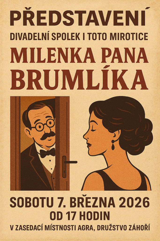 Přijďte na představení divadelního spolku I TOTO Mirotice s názvem „Milenka pana Brumlíka“. Akce se uskuteční v sobotu 7. března 2026 od 17 hodin v zasedací místnosti Agra, družstvo Záhoří. Vstupné je dobrovolné a pozvání platí pro všechny zájemce.